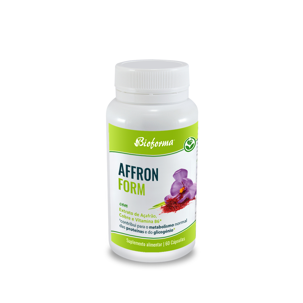 Affronform da Bioforma é um suplemento natural à base de Açafrão, um extrato do estigma de açafrão, Crocus sativus, e enriquecido com Vitamina B6 e Cobre. A vitamina B6 contribui para o metabolismo normal das proteínas e do glicogénio, para uma normal função psicológica e para o normal funcionamento do sistema nervoso.