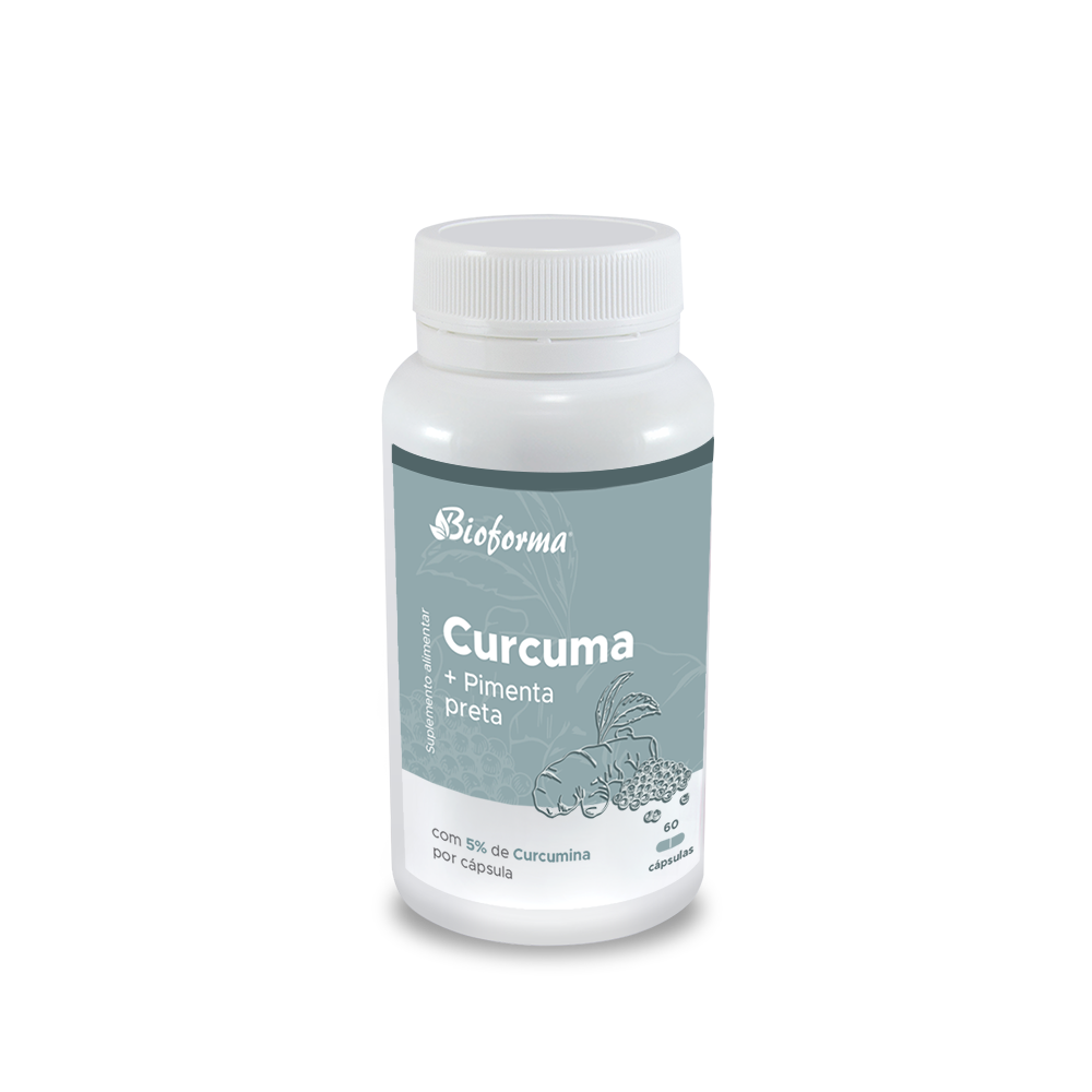 O suplemento alimentar Curcuma+Pimenta Preta, da Bioforma, fornece 450mg de Extrato de Curcuma longa (5% curcumina) e 50mg de Extrato seco de Pimenta Preta (