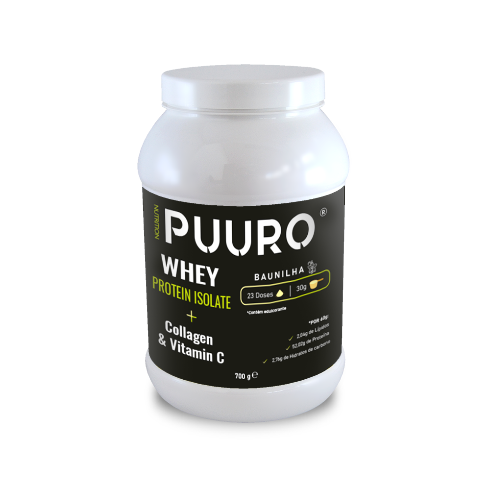WHEY PROTEIN ISOLATE + COLLAGEN & VITAMIN C da PUURO reúne 3 elementos essenciais ao nosso bem-estar: Proteína (do soro do leite), Colagénio e Vitamina C.