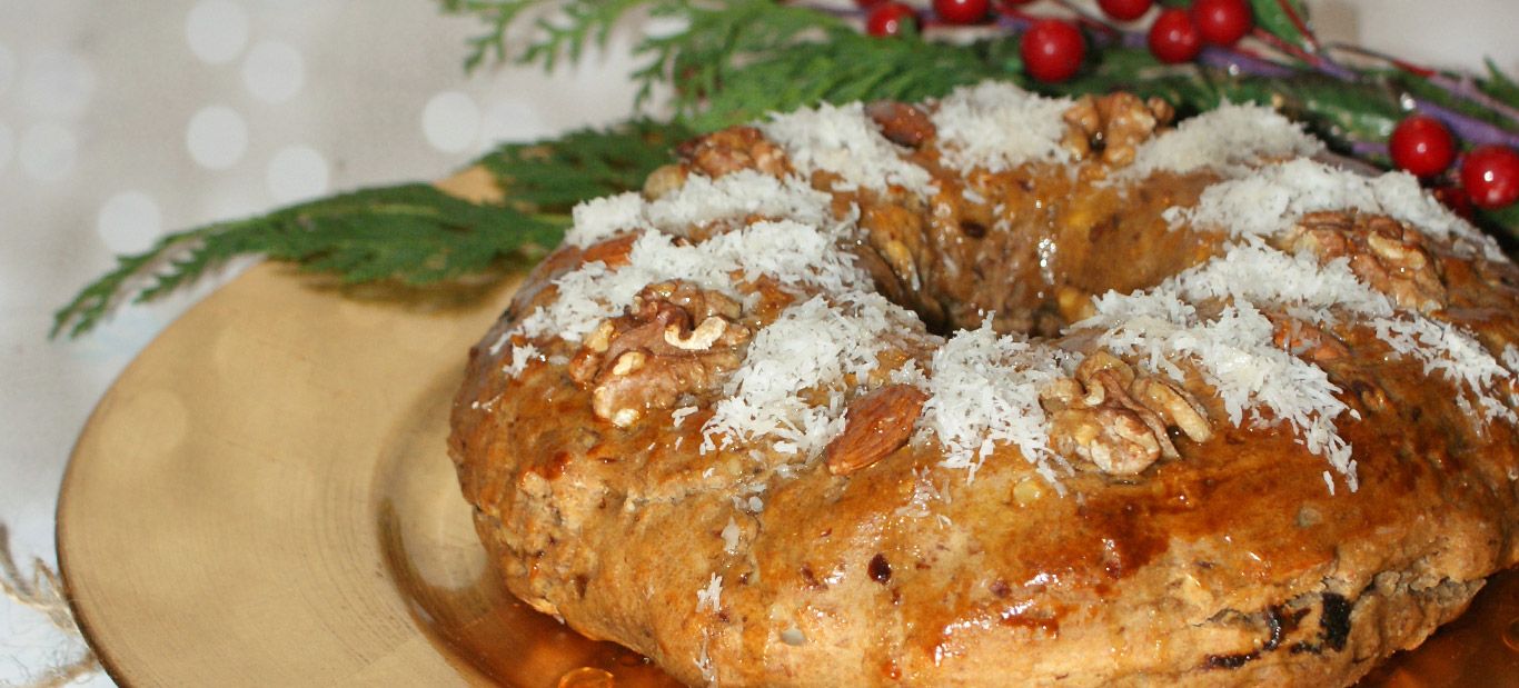 Forme o bolo rainha em forma de anel com com um buraco largo no centro. Decore com frutos secos a gosto e leve ao forno pré-aquecido a 180ºC durante 25 minutos.