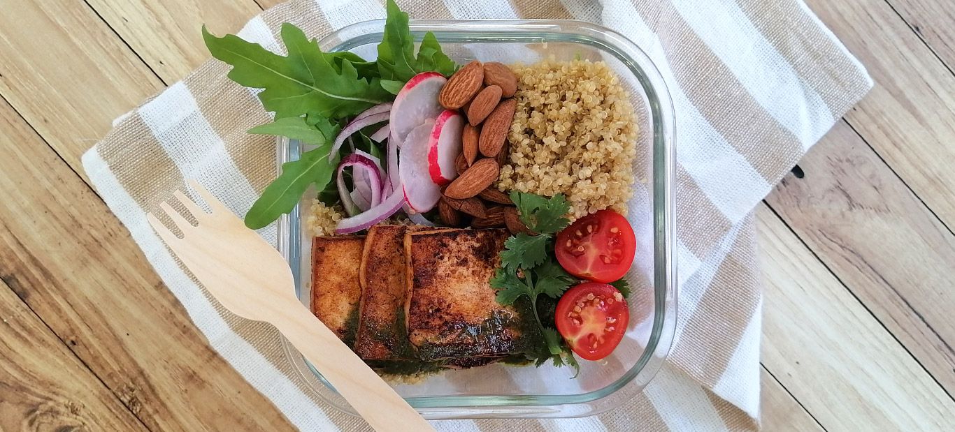 Disponha todos os ingredientes no recipiente da marmita. Adicione o tofu grelhado e regue com o molho Pesto.