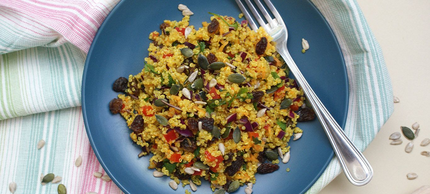 Para a salada - Misture a quinoa, a couve roxa, o pimentão vermelho, a cenoura, a salsa, a hortelã, as sultanas e as sementes de girassol e de abóbora.
