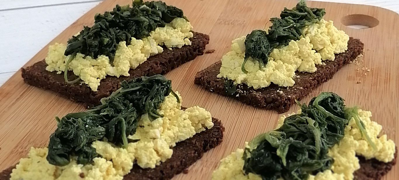 Sirva o tofu mexido sobre fatias de pão alemão e cubra-o com os espinafres salteados.